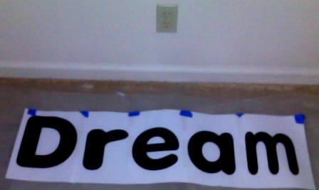 paperdreamI came home and printed out the word Dream. That's a good word for a bedroom isn't it? I tried using a word processing program but I found the 72 point letters didn't come close to what I needed. The word Dream in 72 points, the largest point size available for the font I wanted, was only 5 inches wide. I'd need a magnifying glass for that so I used my scrapbook software to create large letters. The D was the largest at 8" tall and about 5' wide. I taped it all together and went to look for some tracing paper. The picture shows the scale of the word as compared to the wall plug in.